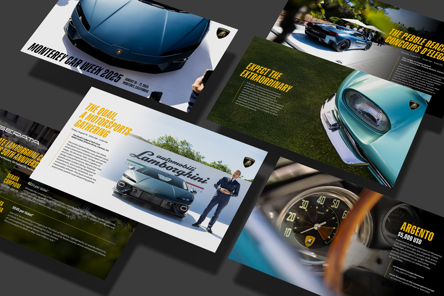 Enhance the brand collateral and design of marketing materials for all Lamborghini America events, ensuring alignment with official brand guidelines.